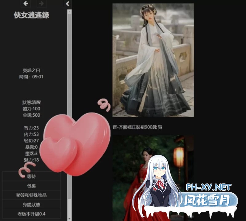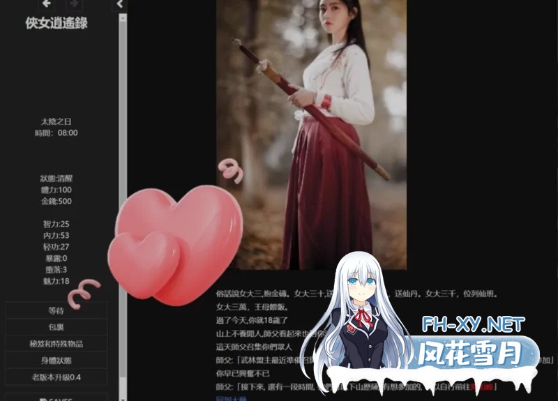 游戏介绍 这是一款无敌超强的[国产武侠古风]HTML式的养成角色扮演SLG游戏。 游戏中你扮演一个江湖女侠,从小成长到到 ...