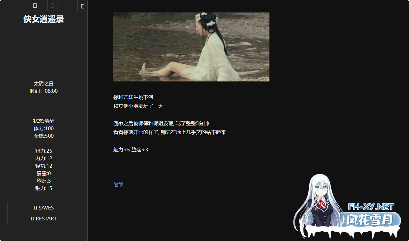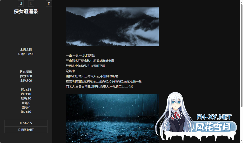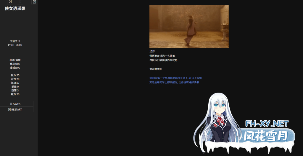 游戏概述: 这是一款无敌超强的[国产武侠古风]HTML式的养成角色扮演SLG游戏。 游戏中你扮演一个江湖女侠,从小 ...